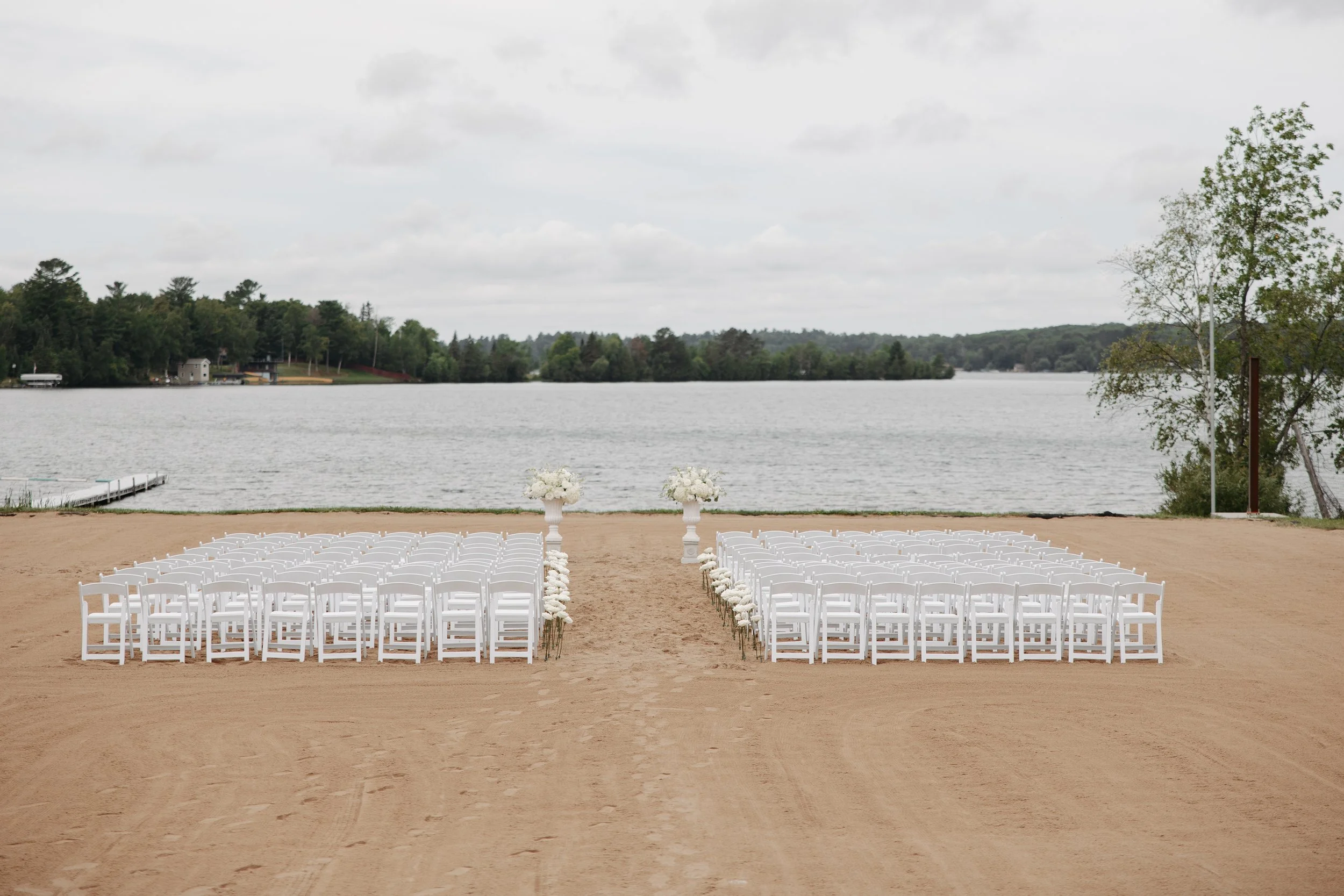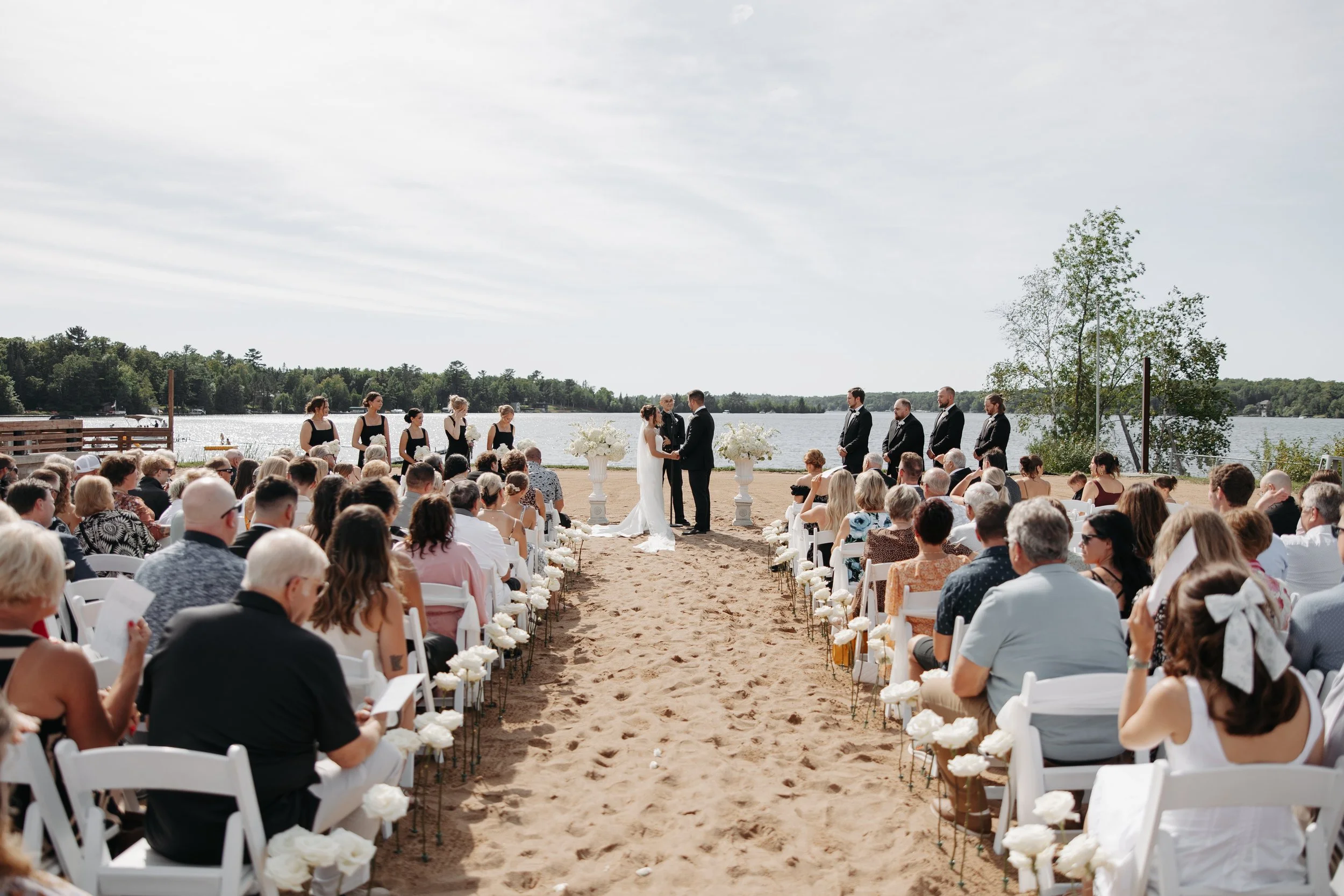 The morning began with clouds hanging overhead and a forecast that hinted at rain. There were a few moments of watching the sky and refreshing weather apps, but Hanni and Andrew made the call to trust their vision: an outdoor ceremony overlooking the lake. And honestly, it was so them—hopeful, relaxed, and full of heart.